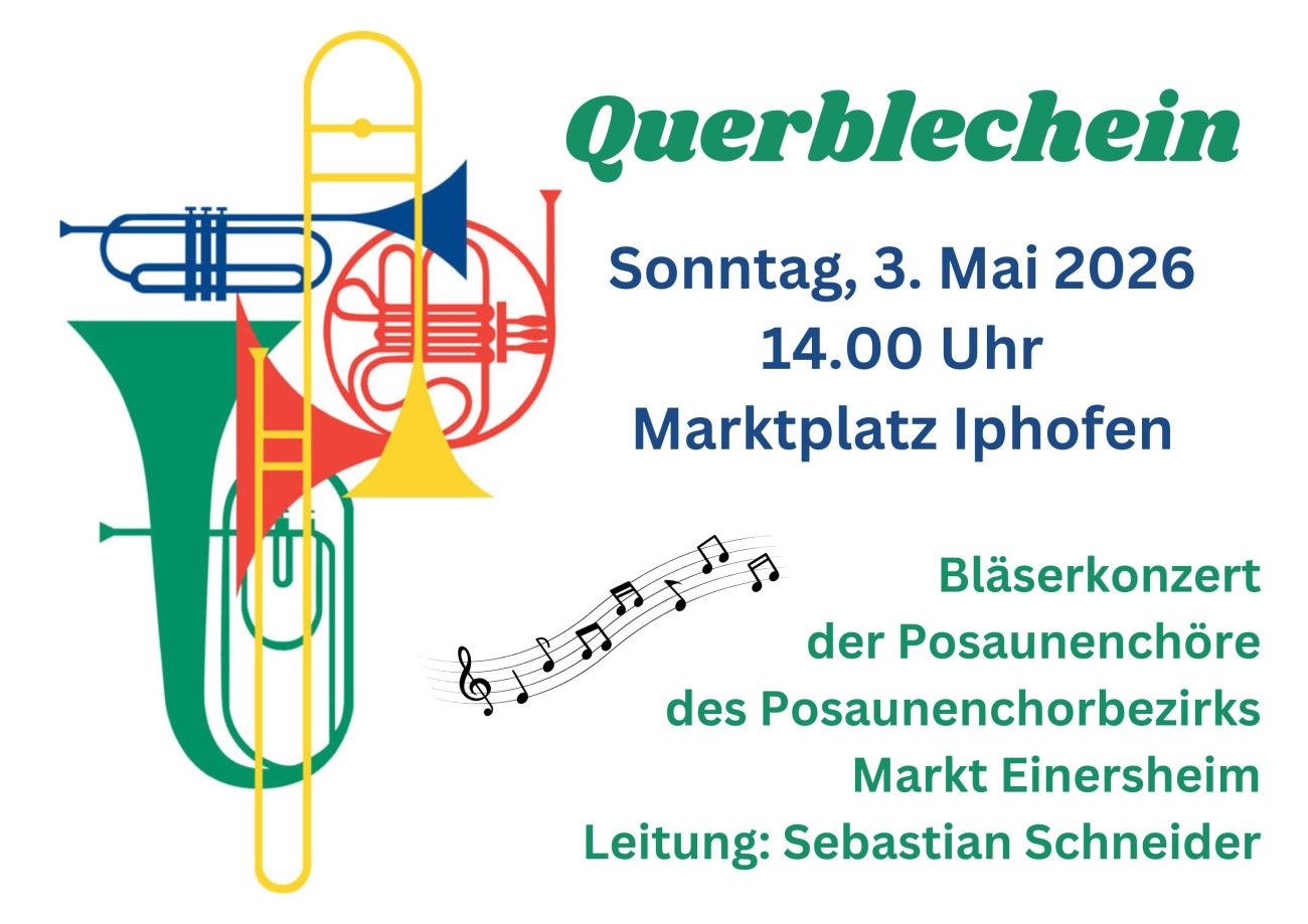 Der Posaunenchorbezirk Markt Einersheim lädt am Sonntag 3. Mai 2026 von 14 bis 15 Uhr zum Querblechein-Standkonzert auf dem Iphöfer Marktplatz ein.